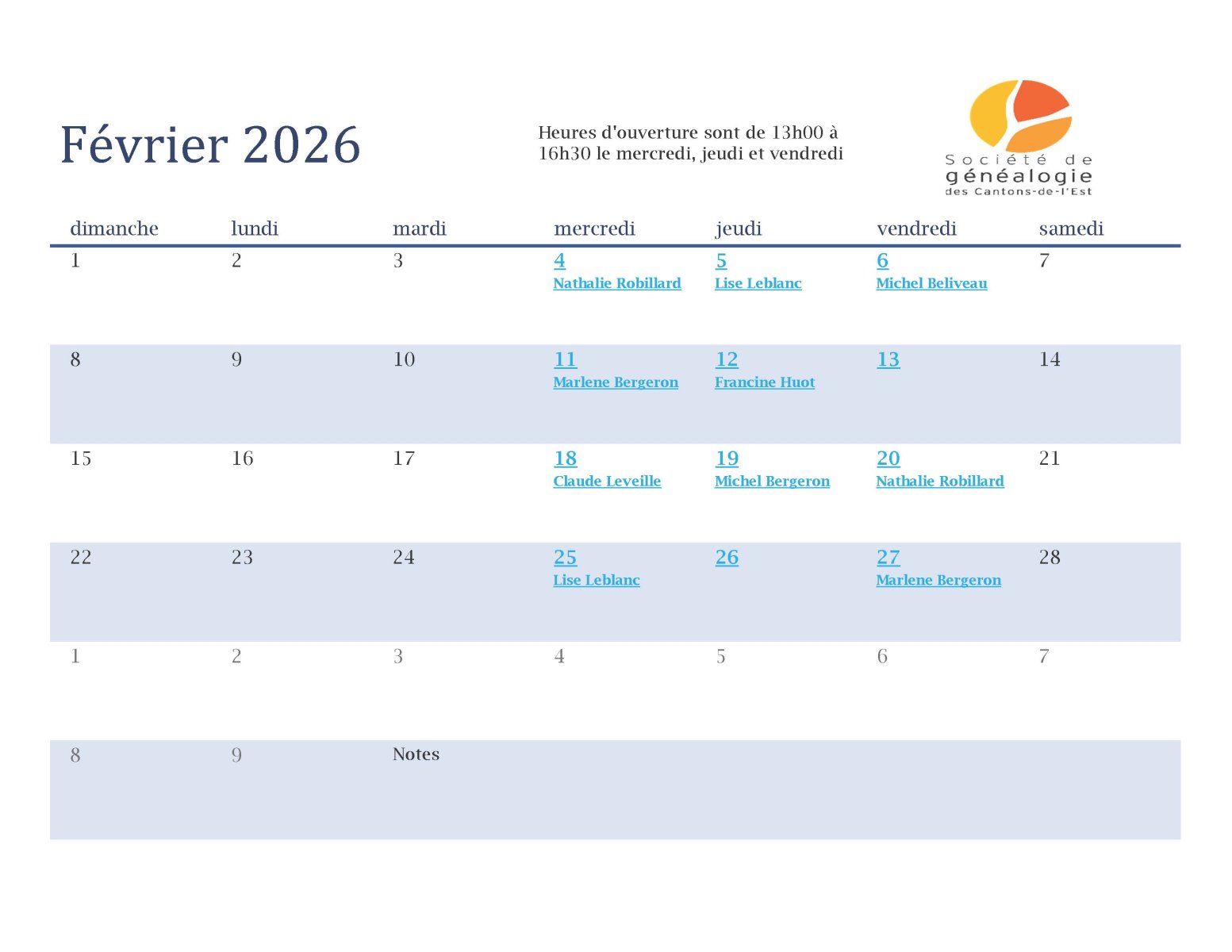 Calendrier d'assistance aux chercheurs pour le mois
